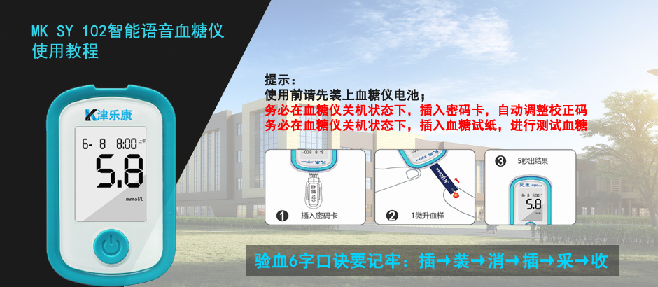民康MK SY102智能語(yǔ)音血糖儀使用教程,提示: 使用前請(qǐng)先裝上血糖儀電池; 務(wù)必在血糖儀關(guān)機(jī)狀態(tài)下,插入密碼卡,自動(dòng)調(diào)整校正碼 務(wù)必在血糖儀關(guān)機(jī)狀態(tài)下,插入血糖試紙,進(jìn)行測(cè)試血糖